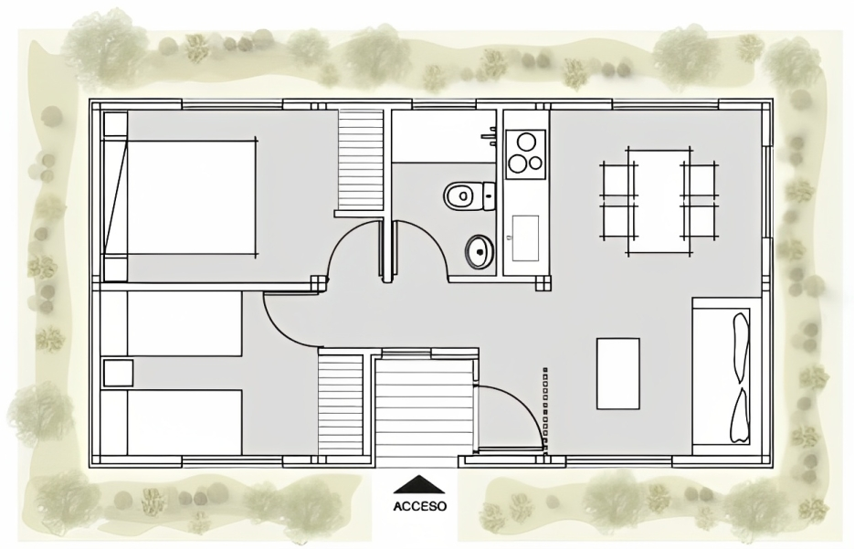 The flooring is composed of sandwich elements, coated with tiles or other floor coverings of your choice. The sides can feature any mix of wall, window, or door elements, adaptable to climatic conditions and cultural requirements. Our designs can even incorporate verandas. The walls are typically composed of an outer and inner panel, filled with a special, environmentally friendly lime foam, a technology patented by SWC. A typical Solarhouse bungalow includes a family bathroom equipped with a bathtub, sink, and toilet.